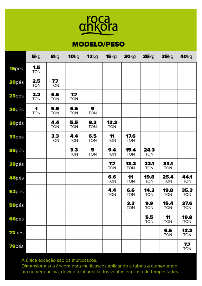 A RocaAnkora de 15 quilos é indicada para embarcações de 30 à 52 pés, porém, depende do peso da sua embarcação. Você pode conferir a indicação na tabela que está em imagens.